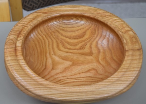 Bob Truesdale showed a bowl he made from an irregular slab of coffee wood. He used 3 centers while turning the bowl and cleaned up both sides so that the edges would not get too thin. He used rattle-can lacquer for the finish. Bob burned a line around the bowl using a wire but had two flats that the wire did not burn so he cut a line on the flats with a saw and went back to burn those lines. It is often suggested to use copper wire to burn the lines, but Bob finds that picture frame wire works well for this. There was also a suggestion from the club to use a guitar string for burning lines in bowls.