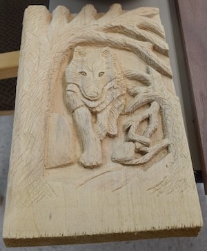 Dan Buholzer showed a wolf in trees relief carving he is working on out of basswood. The carving is still in progress.