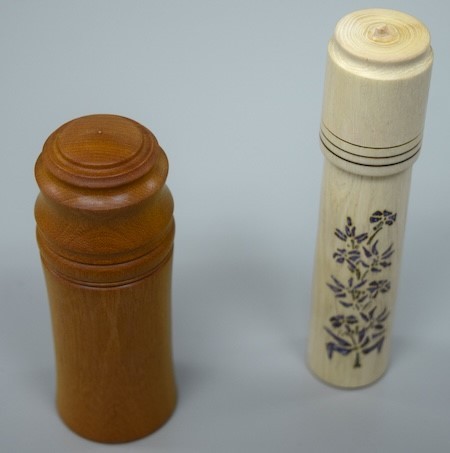 Gary Runyon showed two needle boxes that he made. One was made of hickory, and it had a flared end so that the lid snaps on and off tightly with a nice “pop” sound. The hickory needle box was finished with Doctor’s wood-turning finish.