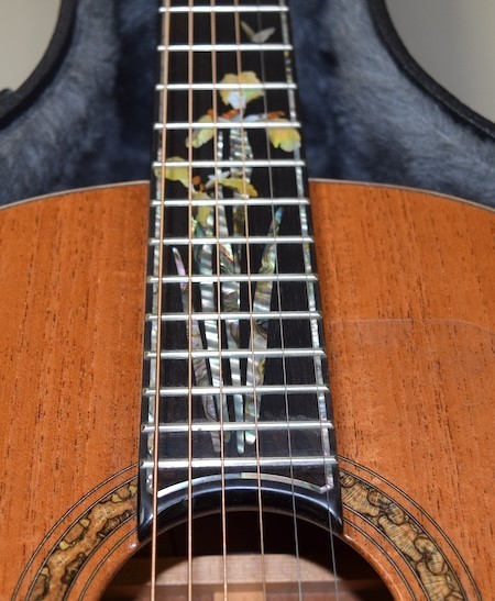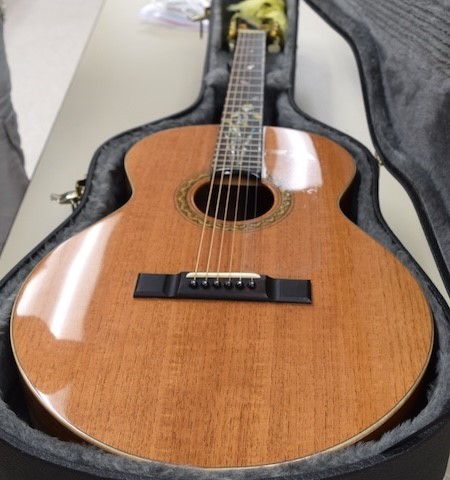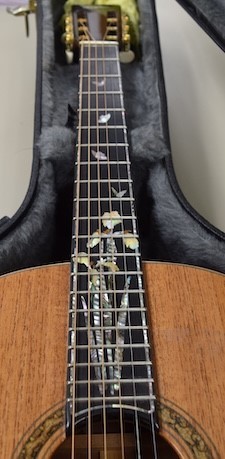 Geoff Roehm brought a “cigar box” guitar he made out of Spanish Cedar which had beautiful inlay that he cut with his CNC machine on the fret board. The truss rod on this guitar is adjusted through the peg head. Goeff worked on this guitar on and off for three or four years and said it is one of the best sounding guitars he has ever made. Geoff said there are several myths in guitar making including that a Stradivarius finish or using Tone Wood will give the guitar a good sound. He said that any structurally sound and stable wood can make a good instrument. (Pic1, Pic2, Pic3)