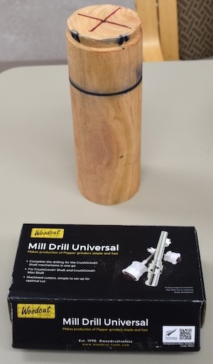 Larry Wendland brought billet used for making a pepper mill. He showed a mill cutter with an adjustable, multiple cutter head function that he found online. The two cutters will cut both seats in 1 pass and the cutters are adjustable so they will work for any mill. This mill cutter can save considerable time when making pepper mills. Pic