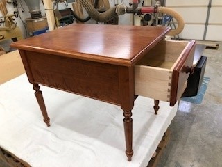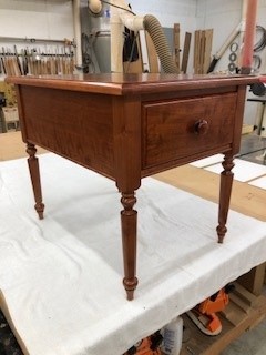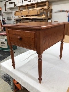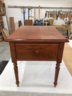 Matt Brothers showed a side table project he made out of cherry with a maple-lined drawer. The legs were turned by Bill Guffey. Matt used a brown mahogany stain with a semi-gloss Lenmar lacquer finish that he got from Hoover Paint. (Pic1, Pic2, Pic3, Pic4)