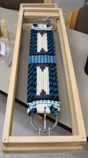 Richard Gulley showed a weaving frame he made out of sycamore. He used a CNC machine to cut the holes at regular intervals. The large version of the weaving frame is about 60 inches long.