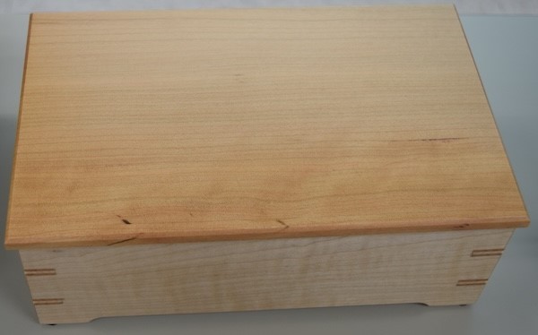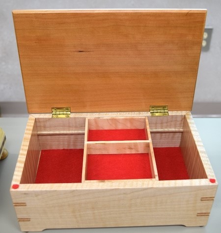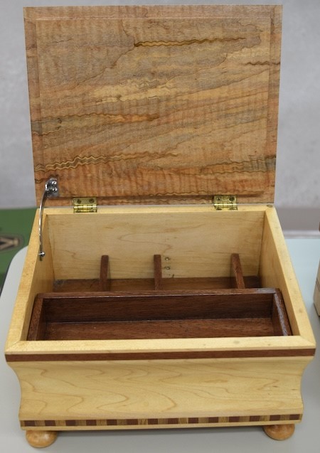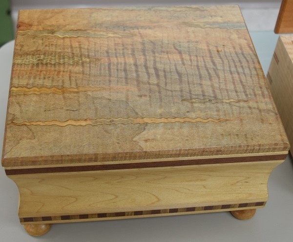 Chuck Taylor showed a sliding tray box he made out of figured maple and quarter-sawn cherry. The box was finished with Deft satin lacquer. The box has red-liner bottoms.