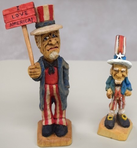 Jim Jolliffe showed two previously presented Uncle Sam caricature carvings since July was our nation’s birthday month. One was based on a Roger Stegall roughout and the other was based on a Mitchell Cartledge leprechaun roughout. Both were finished with boiled linseed oil, acrylic paint wash and rattle can satin lacquer.