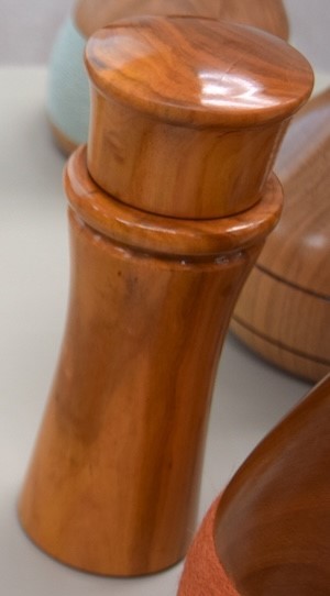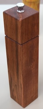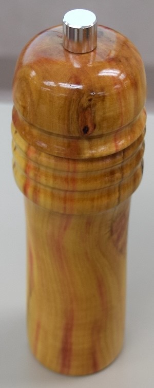 Larry Wendland showed pepper mills he made. He showed one made from box elder and finished with polyurethane, and another that was made from plum with a polyurethane finish. He also showed a square pepper mill that he made from ambrosia maple and finished with a cherry stain. Larry made the square mill to demonstrate a wooden pepper mill that could be made without a lathe.
