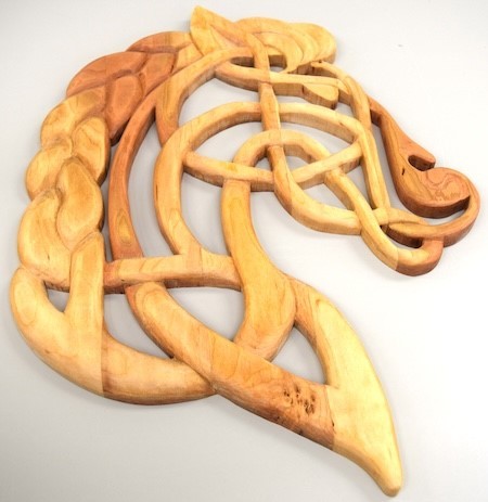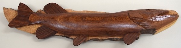 Paul Jalbert showed a Celtic style horse that he carved out of a piece of cherry. He also showed a fish that he carved out of cottonwood bark with walnut fins and finished with Danish oil. This fish was practice for a fish that he plans to carve out of a piece of driftwood.