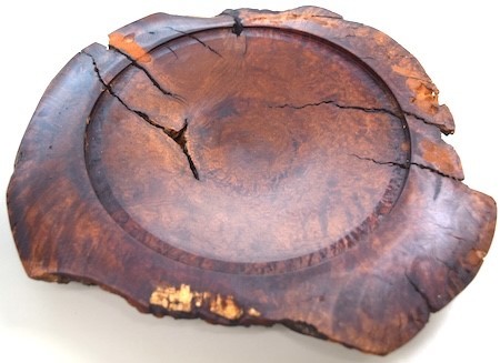 Vince Zaccardi showed a platter he turned from a block of wood that was given to him, and he was not sure of the species. The platter contains natural holes and cracks and was finished with one coat of oil.