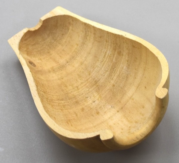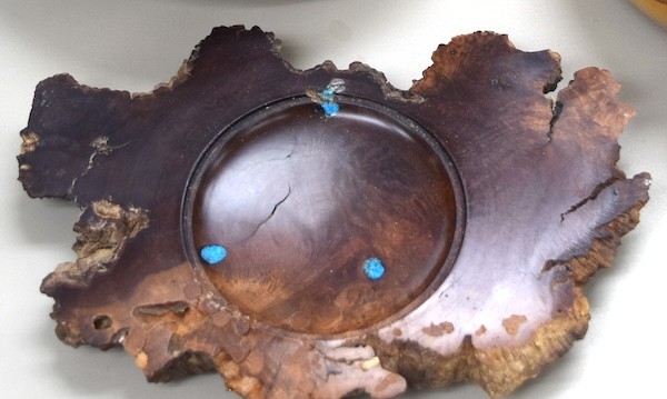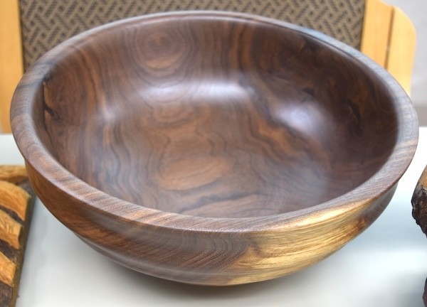 Bob Truesdale showed a walnut fruit bowl that he turned from a tree that his neighbor cut a few years ago. The wood was taken from near the hollow of the tree. Bob finished the bowl with matte rattle can lacquer.