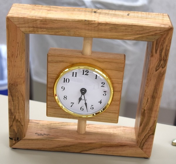 Chuck Taylor showed a wooden tea pot shaped rack he made in 4th grade. He sold it for 25 cents at the time. He also showed a clock prototype he made out of Ambrosia maple and cherry and finished with satin lacquer.