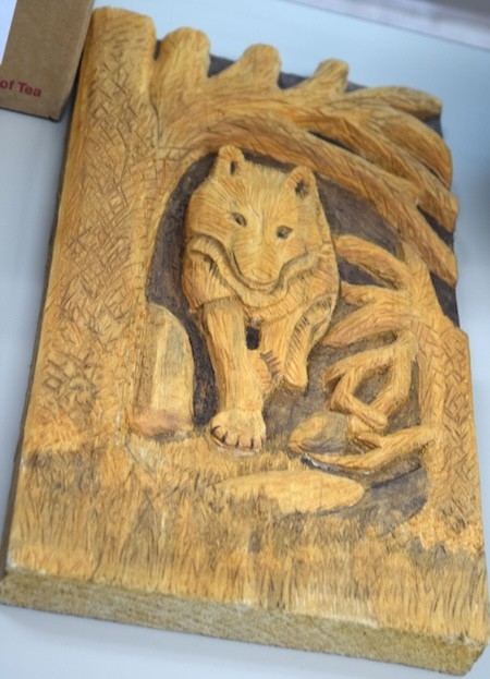 Dan Buholzer showed a wolf carving from basswood that he finished.