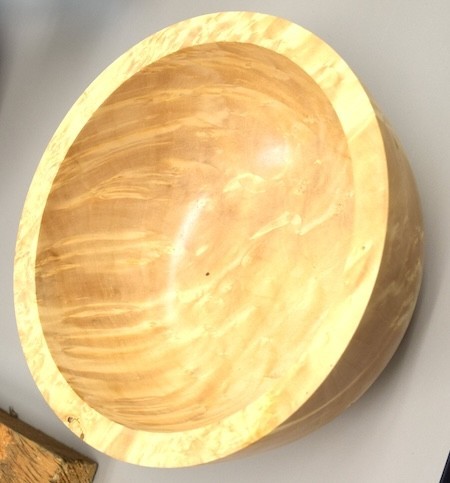 Larry Wendland showed wood he got from a friend in Wisconsin. His friend thought it was Canadian syrup maple. Larry turned a bowl out of it and thought it turned like box elder. The wood is pale with a reddish tint. He finished the bowl with polyurethane.