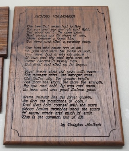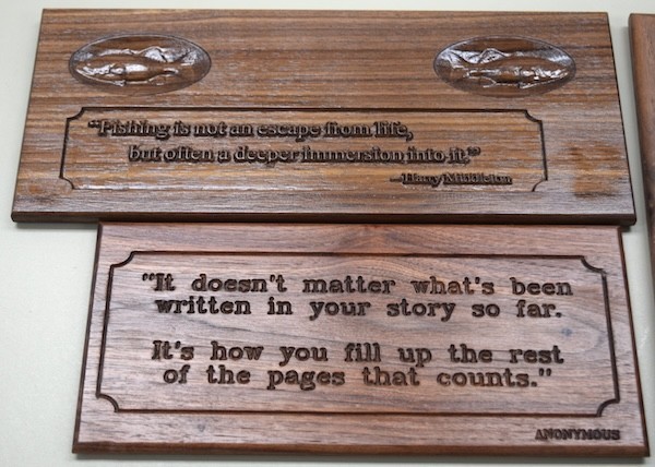 Lloyd Ackerman used a CNC to make a plaque with a saying on it. He used walnut and cut it with a 60-degree V-bit. He also made a fish plaque for his son.
