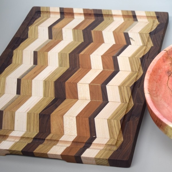 Mickey Knowles showed a cutting board he made for Christmas with chevrons made from scrap wood. He used various woods for the cutting board with walnut being the primary wood. He finished the board with a cutting board finish he got from Home Depot.