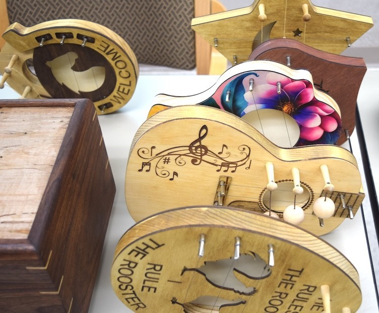 Ralph Elmore showed door harps he made. He went to a horse show, and his aunt had a door harp on her door. He made several door harps over Covid. The harps have shaker pegs, and Ralph used zither pins to make the wires tight. He used a laser to cut the shapes. The interior is made of pine, and he used a heat press and laminate to color the wood on some of them.