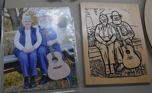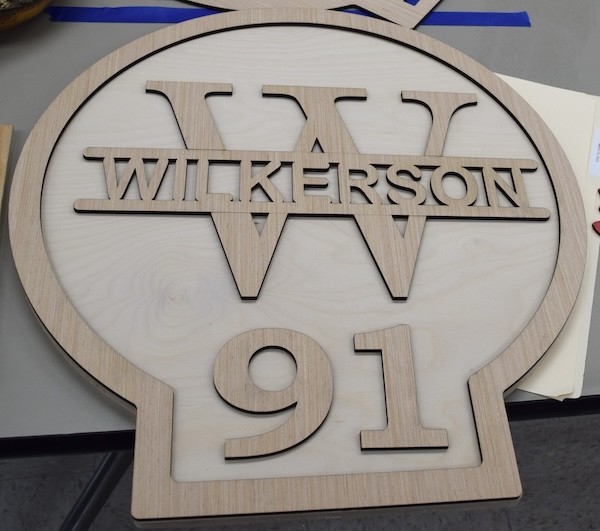 Richard Gulley showed CNC sketch of a picture made for his 50th anniversary. He used software to make a sketch then used his CNC to carve the wood and filled it with black paint. Richard also showed name cutouts he made for three girls at church. He also made his grandson a house number and name that he cut out of Baltic Birch plywood using a laser. Richard plans on painting the house number orange and blue for Auburn.