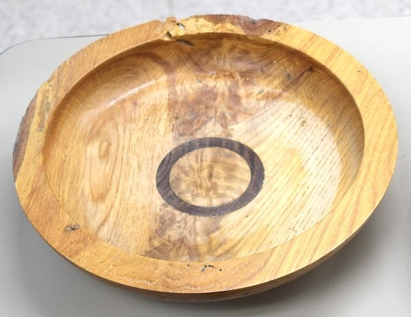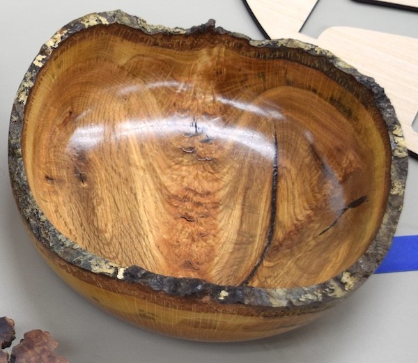 Vince Zaccardi showed an oak bowl with a natural edge that he turned from a tree that fell in his yard. A friend was clearing out his house and had a piece of burl. Vince used friction polish and finished the outside. He also showed a bowl that he turned through the bottom and plugged. Then he turned a hole in the plug so he plugged the plug. He lacquered some of the bowl, but it is too cold to finish lacquering it at the moment.