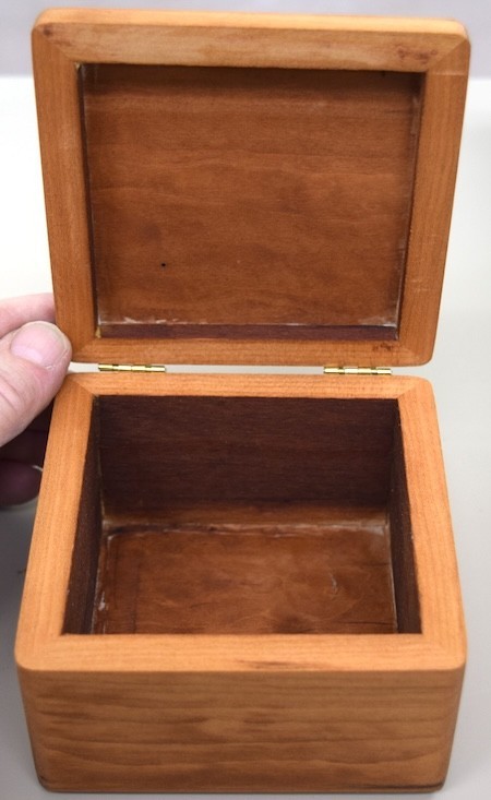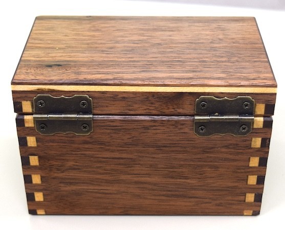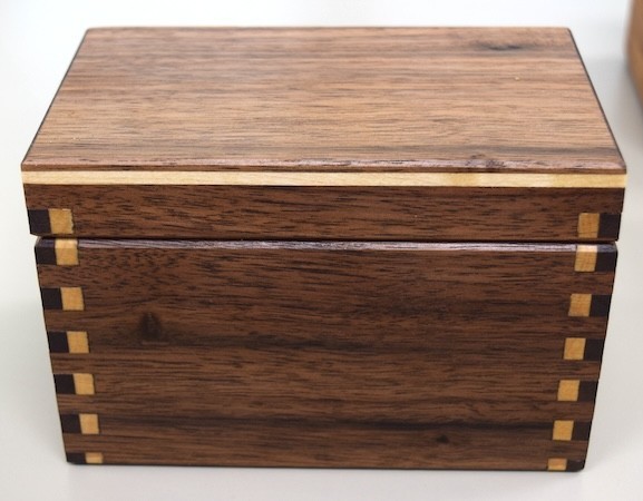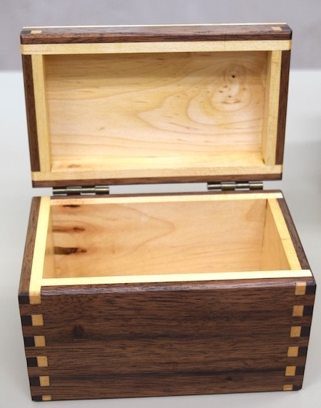 Rick also showed a walnut and maple finger-jointed keepsake box. He tried two different maple wood grain directions to provide better color contrast. Using maple end grain at the end of the finger joints worked best. The boxes were finished with an Osmo-Polyx top coat.(Pic4, Pic5 , Pic6)
