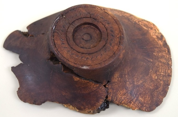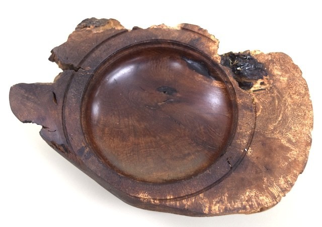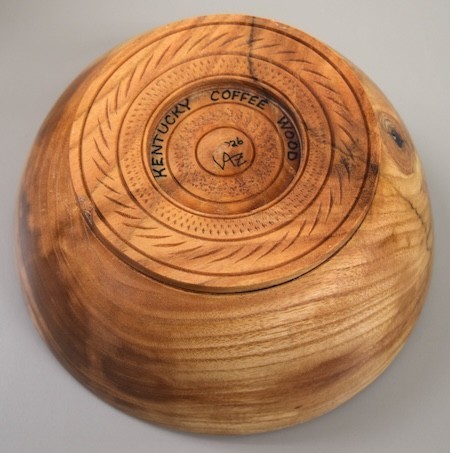 Vince Zaccardi showed a Kentucky Coffee Wood bowl he turned. The wood was provided to Vince from Bob Truesdale. Vince also showed a burl bowl he turned. Both were finished with friction polish. (Pic1. Pic2, Pic3, )