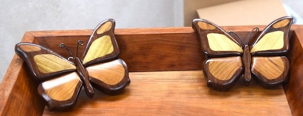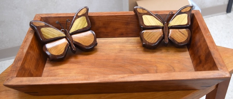 Brenda Zuccaro: Showed two small intarsia butterflies made from walnut, cherry, and maple, finished with linseed oil and lacquer.