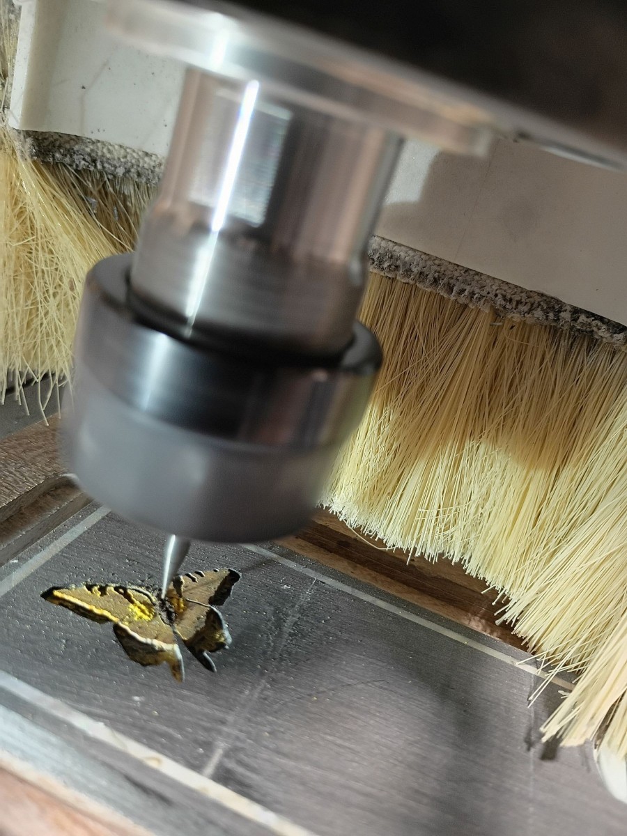 A butterfly undergoing post-inlay CNC work to be filled with epoxy (using a 0.01″ bit).