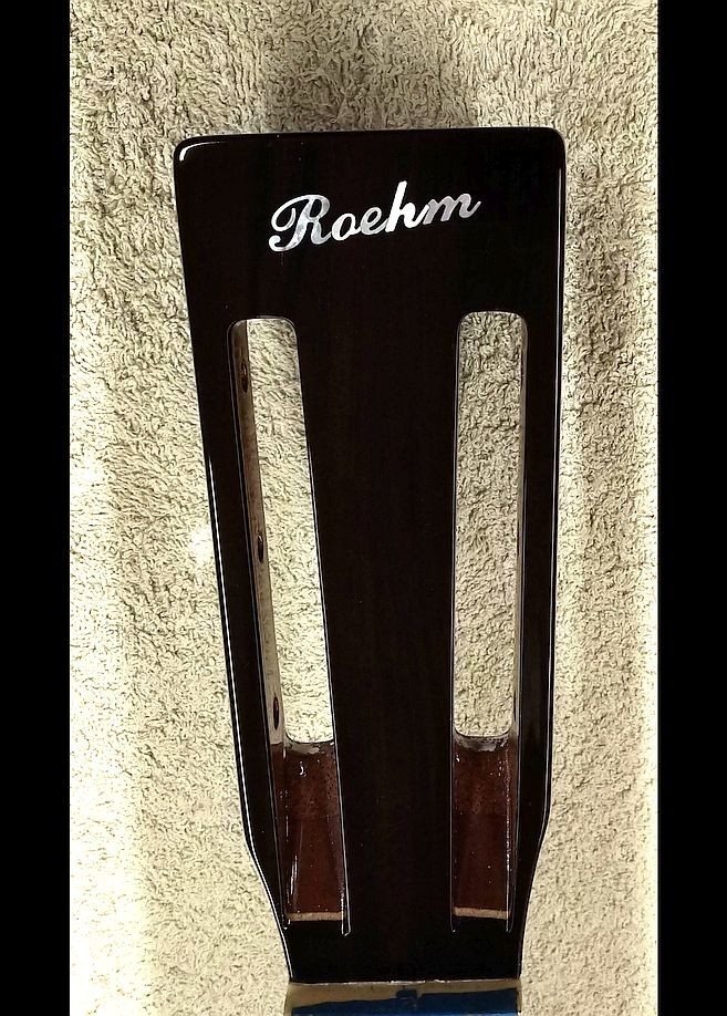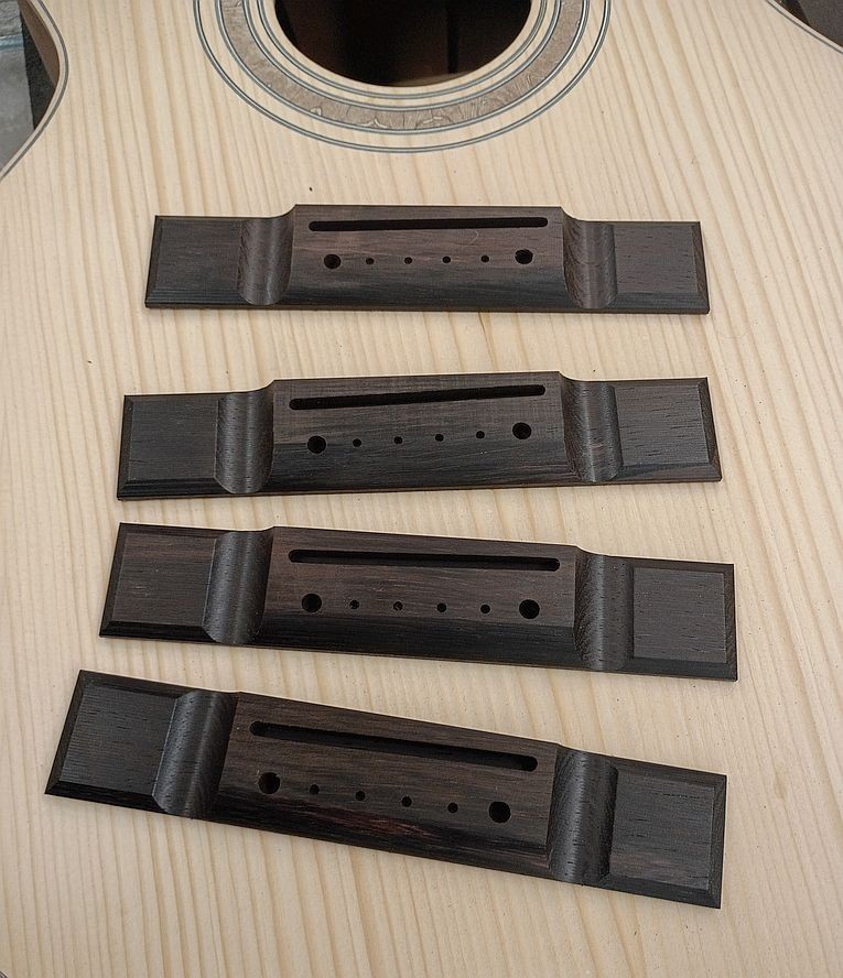 Guitar components including Brazilian rosewood bridges, necks (machined on their sides to allow for undercuts), and a 12-string guitar fingerboard.