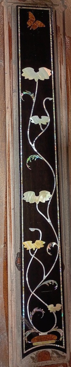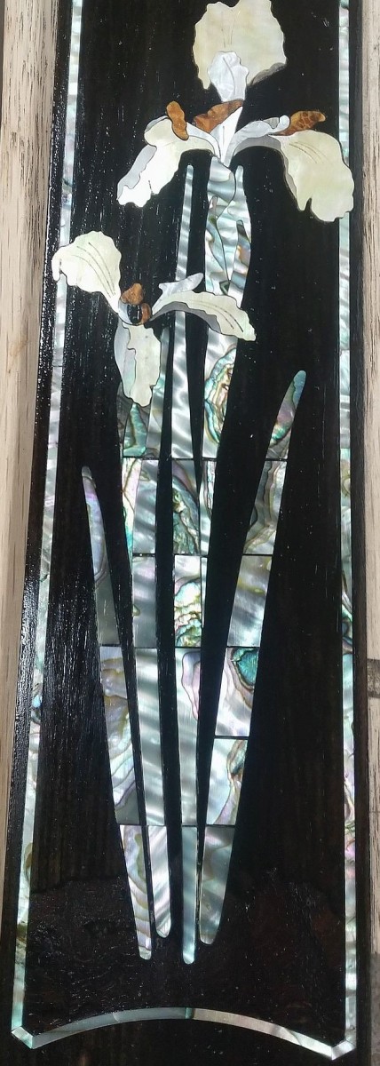 Intricate inlays featuring Art Nouveau designs, “Beardsley Borders,” and a Chinese Iris. Materials used included mother of pearl, abalone, chittum, dyed walnut, and reconstituted stone.