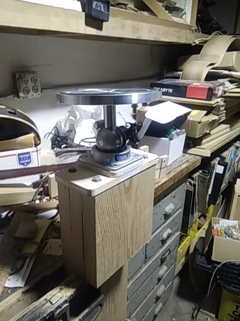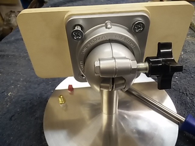 A custom vacuum clamp with a ball joint and rubber gasket used to securely hold guitar bodies during construction.