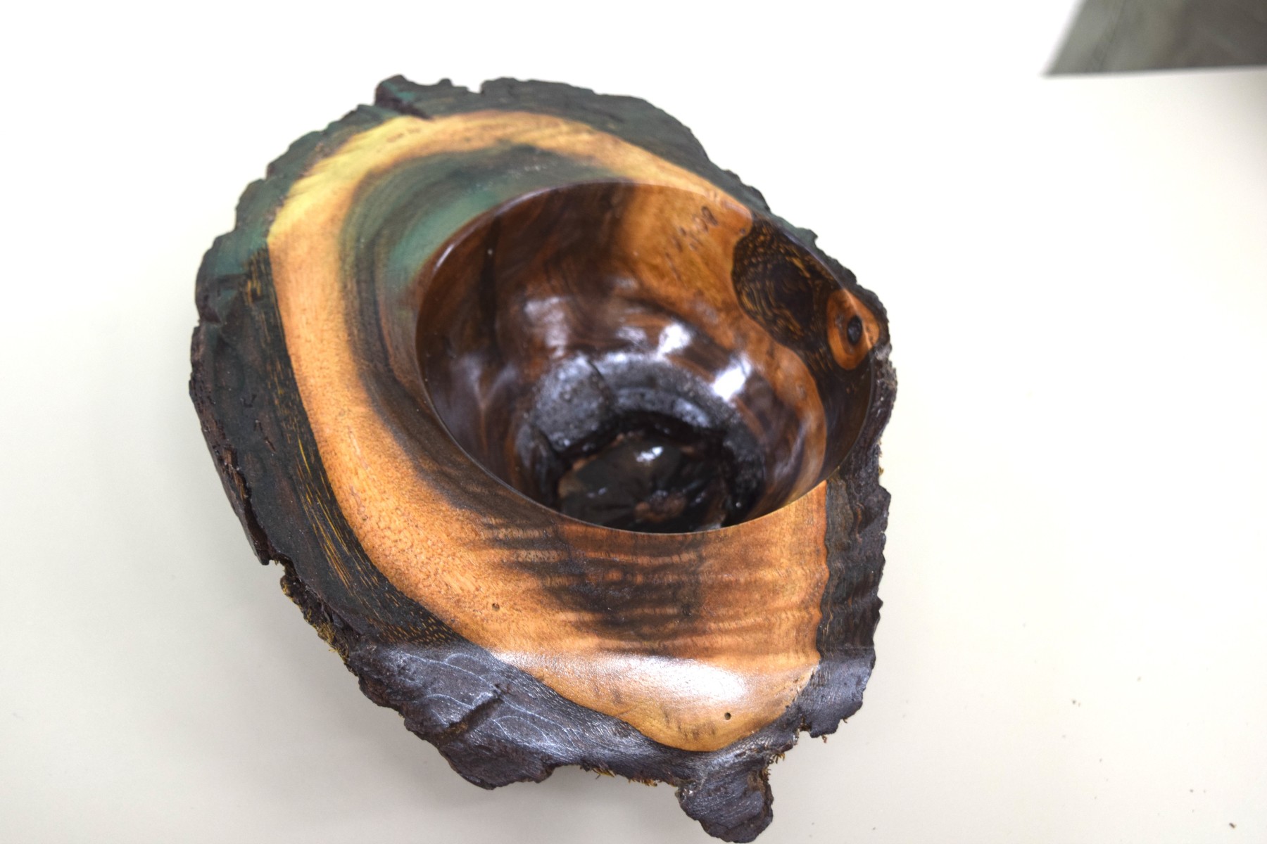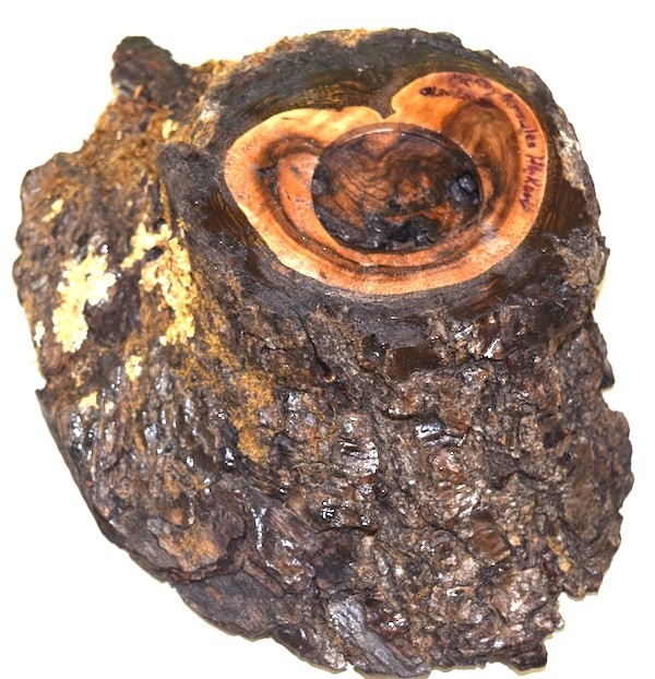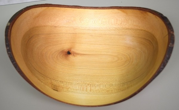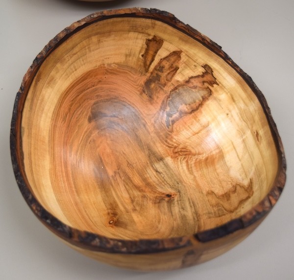 Mickey Knowles: Showed a turned hickory bowl. He used a faceplate for the start, retained a natural mushroom feature in the bottom, and kept the natural bark on the exterior. Finished with sanding sealer and lacquer.
