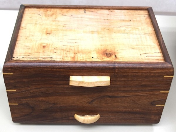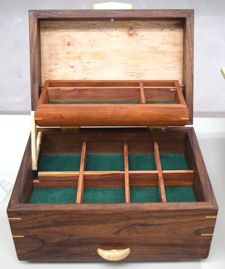 Michael and Brenda Zuccaro: Showed a walnut box with an ambrosia maple top, featuring a tray with a maple hinge and a French polish finish. Michael also presented a bread-proofing box featuring a removable splined bottom, splayed tapers, and dovetails.