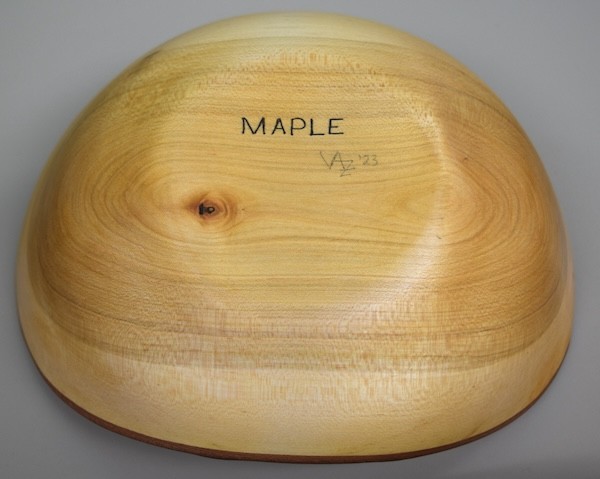 Vince Zaccardi: Presented a maple bowl with an oil finish. He shared a second piece that began wobbling mid-turn due to a separating tenon; he corrected this by gluing a new piece of wood and veneer to the bottom. Vince also shared results of a finish experiment on cherry using linseed oil, Danish oil, and walnut oil. While surface appearances were similar, the linseed and walnut oils soaked through the wood while the Danish oil did not.